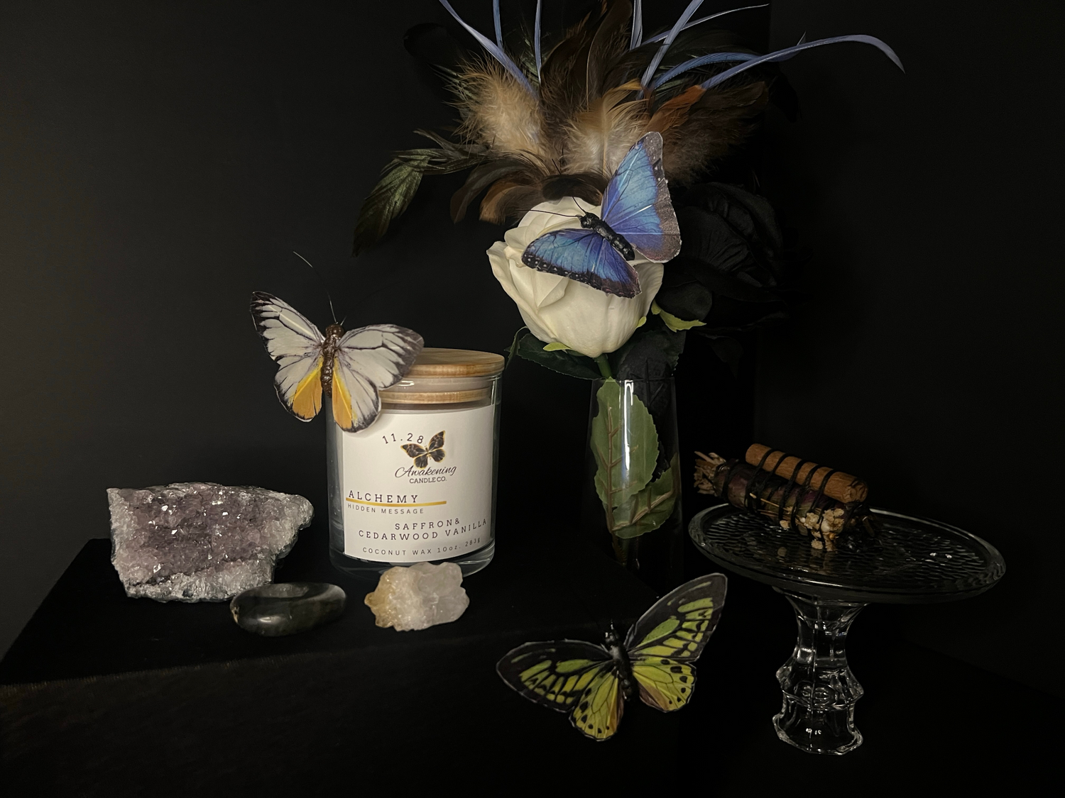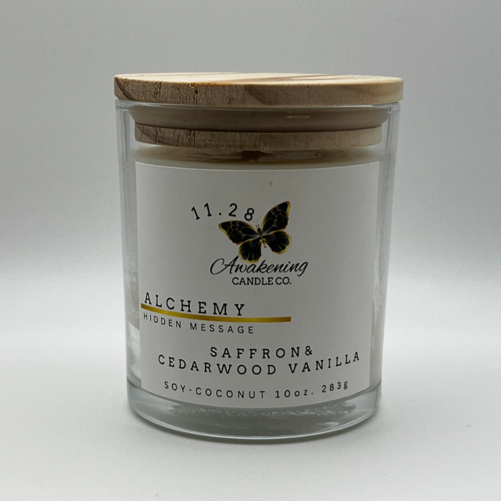 Alchemy is a vessel of transformation- where wax turns to light, and the hidden becomes known. As your candle burns, a secret message slowly reveals itself, offering insight meant just for you. The warm spice of saffron, grounded by cedarwood vanilla, evokes the sacred process of turning your inner lead into gold. Let this candle be a symbol of the alchemy happening within.