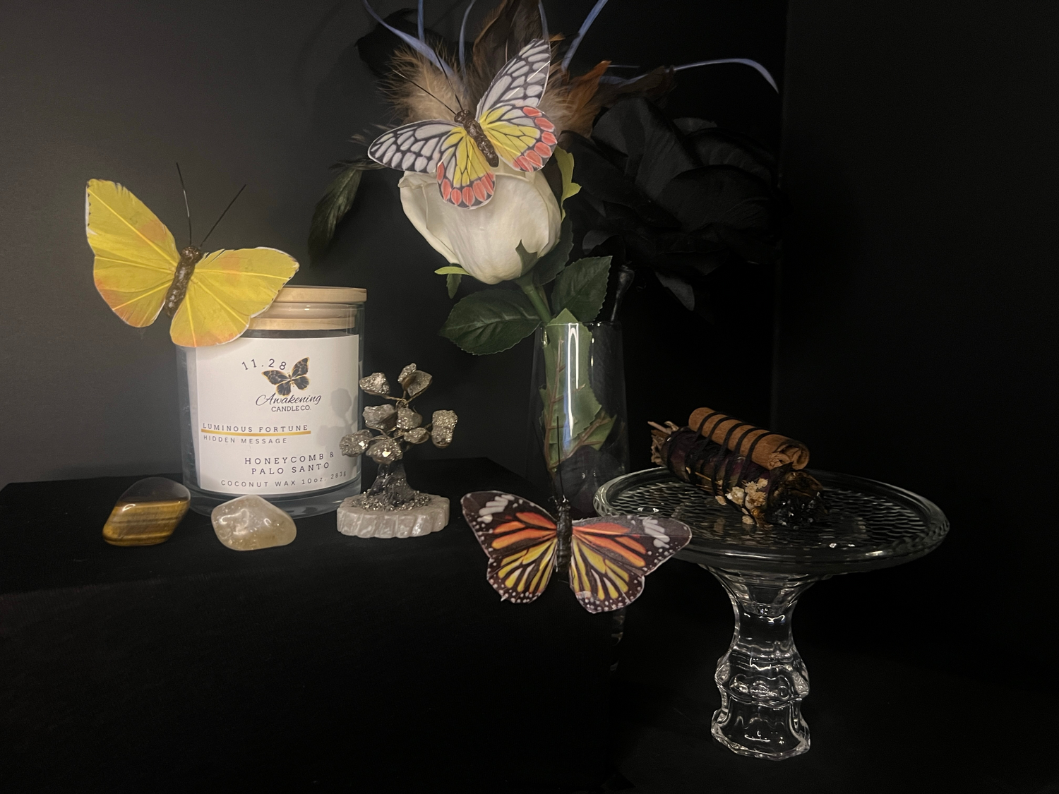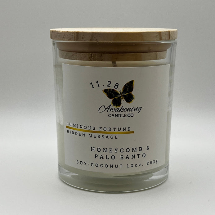 Luminous Fortune carries the light guiding you towards abundance and alignment. As the flame flickers and softens the wax, a message emerges- an omen from the universe pointing you toward blessings on your spiritual path. Sweet honeycomb blended with cleansing palo santo fills the air with sacred optimism. Trust that fortune glows brightest when led by spirit.