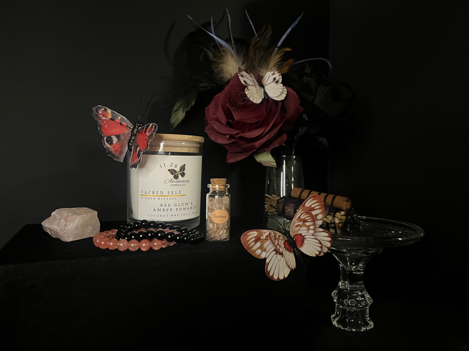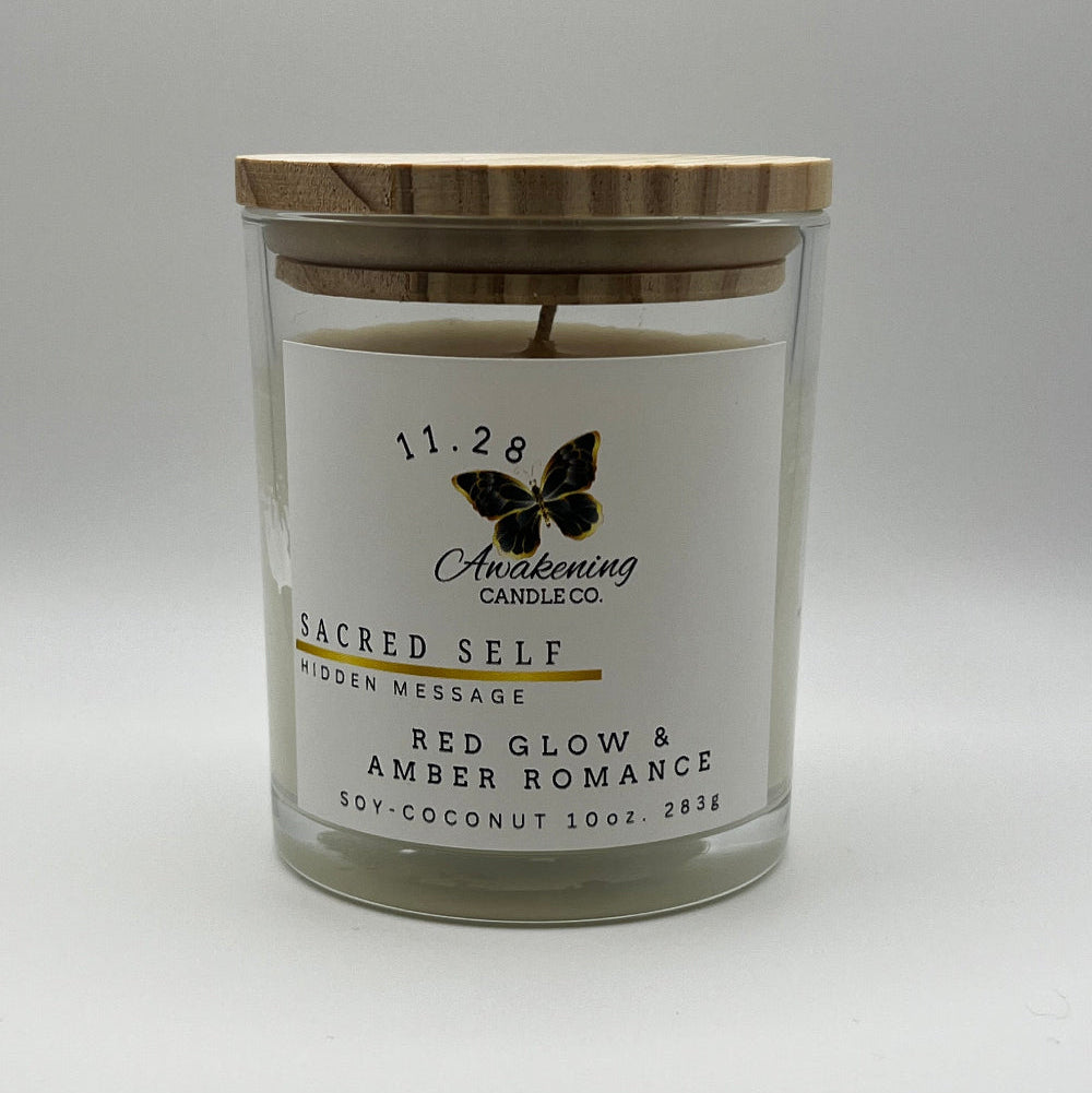 Sacred Self is a tribute to your divine inner being. with each burn, the candle peels away layers, revealing not just the hidden message, but a mirror of the truth. the bold richness of red glow and the deep, golden warmth of amber envelop your space in reverence and restoration. Let this be a ritual of remembering who you truly are.